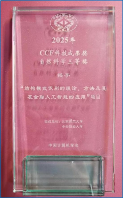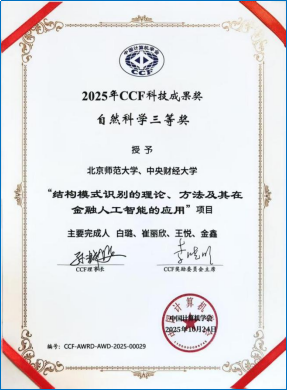 在中国计算机大会CNCC 2025召开期间,CCF颁奖典礼于10月24日在哈尔滨华旗饭店华旗礼堂隆重举行。CCF王选奖、CCF海外科技人物奖、CCF青年科技奖、CCF科技成果奖颁发。yl23411永利集团崔丽欣副教授团队与北京师范大学合作完成的项目《结构模式识别的理论、方法及其在金融人工智能的应用》荣获2025年度“中国计算机学会(CCF)科技成果奖”自然科学三等奖,yl23411永利为第二完成单位,团队成员还包括yl23411永利集团王悦副教授和金鑫教授。